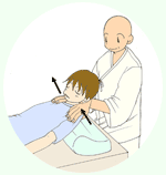 【十字托法】は両手を交差し前腕部分で患者の頭部を支え、 両手で患者の肩を押さえながらゆっくりと患者の頭部を持ち上げて頚部を前屈させていく手技です。